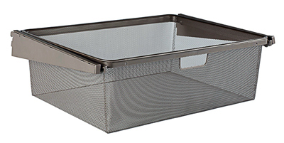 7", closet culture mesh basket, champagne nickel finish, wire mesh construction, can be installed to slide or to sit on a shelf, handle allows for easy pullout access to clothes or linens, easy to install, use with basket surround kit sold separately, dimensions: 16.5625"d x 7.4375"h x 22.25"w.